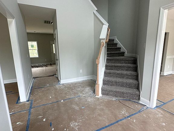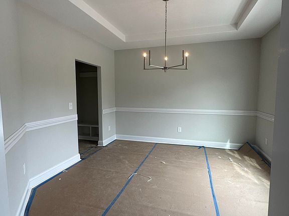 The Brookstone presents itself with a classy curb appeal of medium gray vinyl siding on the main exterior, and a front bump out with a silvery blue siding. Adding to the elegant appeal is a stately yet inviting covered front porch with a welcoming white front door that leads into a grand foyer. Upon entrance into the 2880 square foot luxurious home is a wide-open two-story foyer with LVP flooring of various shades of grays. The same flooring is shared with the kitchen, den, and dining room, and so are the neutral, soft gray walls creating a smooth flow throughout the home. To the right of the entrance is a handy coat bench, the entrance to the garage, and the dining area with a trey ceiling and a sophisticated white chair rail. There is also a half bathroom to the left which mirrors the other three full baths with lovely rich, dark cabinets with brushed nickel pulls, and a warm and neutral tile floor. Moving along is a sizable kitchen with white granite countertops, fine dark wood cabinets with brushed nickel pulls, and a handy breakfast nook with tall windows. To the right of the kitchen is an in-law suite, a warm and plush neutral-tone carpet, a full bathroom, and a walk-in closet. Shifting to the left of the kitchen is the living room with an abundance of wide-open space, a door to another covered porch, an electric fireplace with a chic floating mantel and a gorgeous stone surround of browns and tans, one of the two double-door entrances to the office/den, and a large picture window. Circling around to the front of the house again are the stairs to the second floor opposite the second office/den entrance. Upstairs has a sizable landing and entrances to an oversized laundry room with tile floors, a massive bonus room, and one of the bedrooms. All bedrooms and stairs share the same lush carpet in neutral browns and tans. Adjacent to the landing is also a full bathroom, another bedroom, a hall closet, and the primary suite with an oversized closet and large bathroom. The shower in the en suite has twelve-by-twelve tiled walls and mosaic tile floor, adding to the lavish feel of the home.