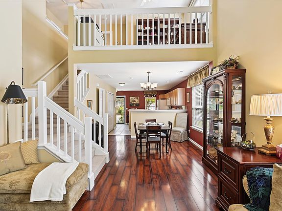 Flooded with natural light and soaring ceilings, this end unit townhome features an open design with the primary bedroom on the main level. This well maintained, one owner home, is in turn-key condition. The large great room which includes the living and dining area boasts two story high ceilings with ceiling fan and gorgeous St. James Vintner's Reserve laminate floors. The floor extends into the primary bedroom which also has a cathedral ceiling with fan. The hall to the freshly updated primary bath is flanked by closets on each side. The primary bath recently had a facelift with new ceramic tile floors, new custom vanity, countertops, and faucets. The large standup shower finishes the space. The kitchen is spacious, offering plenty of counter space and tons of cabinets.The loft area upstairs provides flex space for use as a study, office, multi-purpose, or rec room. There are two additional bedrooms upstairs. One features a large walk-in closet and both have cathedral ceilings and ceiling fans. There are new, cordless blinds on all the windows throughout the home. There is a wooded buffer behind the home providing extra privacy while enjoying the screen porch. The community pool is about 1/5th of a mile away. Persimmon Hill Townhomes is an active community conveniently located close to shopping and restaurants.