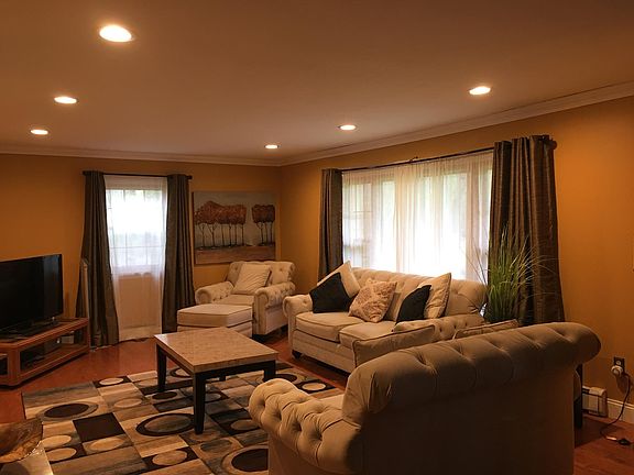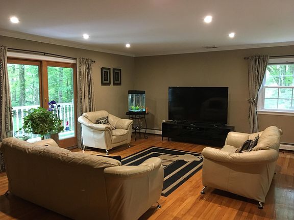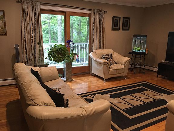 A homeowners delight! This is a well maintained 4 bedroom, 2 bathroom house that sits on a serene, flat 2 acre property. The house is surrounded by lush forests and protected woods. This beautiful 2240 sq. ft. house has lovely honey-tinted wooden floors, and a spacious living room with high-efficiency fireplace insert. The open plan sitting room, dining room, kitchen and sliding doors open up to a front deck provide a refreshing view of the front garden. The well-lit kitchen is set up with updated appliances, granite countertops and a view of the woods. With large windows on every plane and updated french sliding doors, plenty of light is let in keeping the house cozy through the winter and cool in the summer. French sliding doors from the living room open up to the deck making this the perfect space to entertain. Attached is a two-car garage. Recent updates to the house include a new roofing, fridge, water-tank and fresh paint. The property is located minutes away from Wilton Town Center, the train station, Wilton Public Schools and neighboring towns like New Canaan and Ridgefield CT.