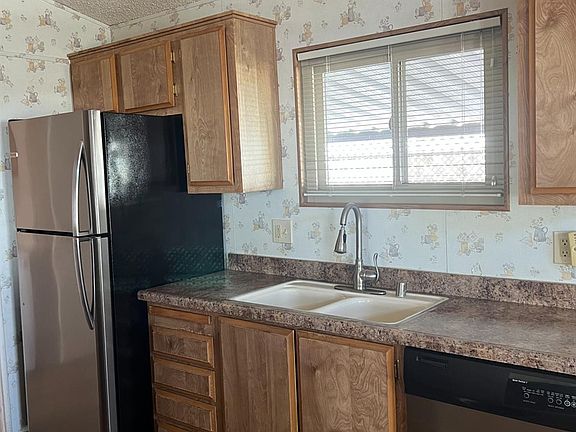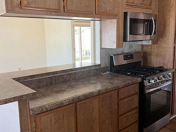 Located in the Ojai Villa Estates (55+) Park, towards the center of the park with easy access to the clubhouse and bike trail. The living room has vaulted ceilings. Newer appliances and flooring in the kitchen with dual-pane windows throughout. The primary bedroom has a very large closet with an attached bathroom. From the front porch, there are beautiful mountain views. This park requires buyer approval prior to purchase.