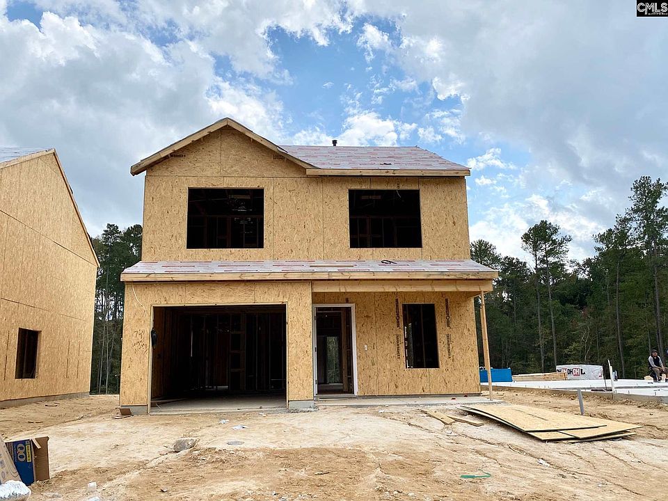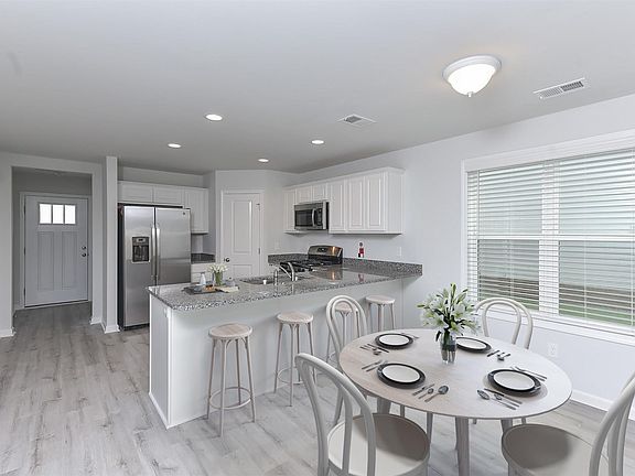 The Evans is a two-story home featuring the primary suite on the first-floor. The kitchen is just past the entry-way and is complete with stainless-steel appliances, granite countertops and an L shaped peninsula that overlooks the eat-in space and family room. Luxury vinyl plank flooring runs throughout the downstairs common areas. The primary bedroom has a separate tub and shower, double sink granite vanity, and large walk-in-closet. Upstairs are two secondary bedrooms which have walk-in-closets and easy access to the upstairs hall bath. The second-floor is complete with a bonus room that provides an additional living space. Outside you'll find a covered back porch with attached storage shed and front yard irrigation.