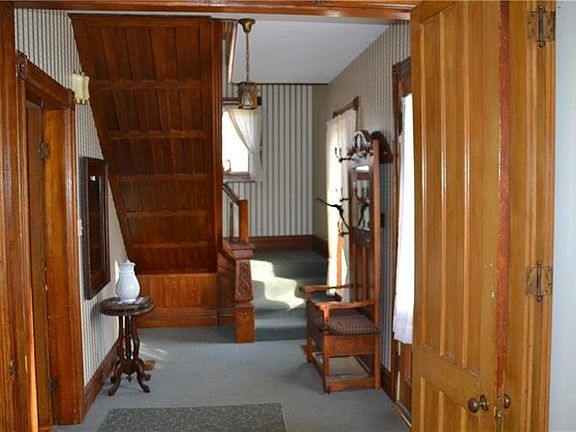 HISTORY DOES REPEAT ITSELF in this Classic Colonial filled with unique and original features inside and out. Built by an area master craftsman in the late 1890's find beautiful hand carved woodwork throughout to include an ornate staircase and fireplace mantle, untouched by paint moldings, window and baseboard trim, original light fixtures, floor to ceiling wood folding privacy doors, a small unique metal fireplace and gleaming hardwood floors. Updates in recent years include the kitchen with eat in counter, a large 2nd floor bath, and a charming open side porch. There is a deep backyard and patio area and a 10x24 storage barn and lots more storage at the back of the house. Basement is dry with updated electrical, public water and sewer. Perfectly Located near Ft. Drum and Watertown.