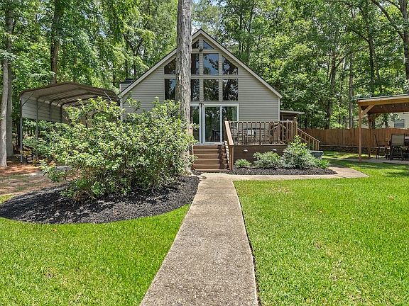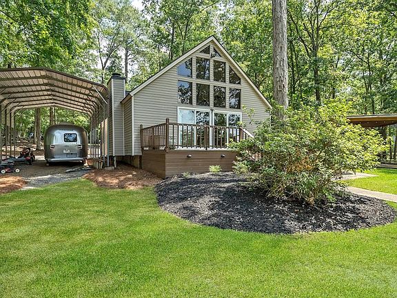 If you've been looking for a rustic lakefront cabin on beautiful Lake Sinclair, I just found it for you! This spectacular lakefront A-Frame cabin on a large, level lot on Lake Sinclair. This home is situated in a wide cove which offers big & peaceful views of the calm water which is safe for swimming but yet is only seconds to the large, open water where all the action happens - there are stunning views of the big water from the dock! This is truly one of the most pristine and beautiful lots I've seen, very flat and level, great water depth (5-6 feet), 1.44 acres, plenty of yard space and entertaining area. Inside the home, you have a wall of windows that go floor to ceiling and showcases the stunning lake vistas this property offers, vaulted ceilings, beautiful beams running through the living room and a very open concept. There are 2 bedrooms and 1 bathroom on the main level with a large living area and wood burning, stone fireplace. Kitchen with granite counters, plenty of cabinet space, island with bar stools and a generously sized dining space. Sliding glass doors lead you to an open porch but just around the corner is a screened in porch with an outdoor shower, a large covered patio area with a TV mount, outdoor lighting & table, and a firepit area. Upstairs there is a bedroom with an ensuite bathroom. This would be a great lake house where lots and lots of memories will be made! Call today and let's get you SOLD on Sinclair! This is an access strip $100/year and fee simple outside of the strip.