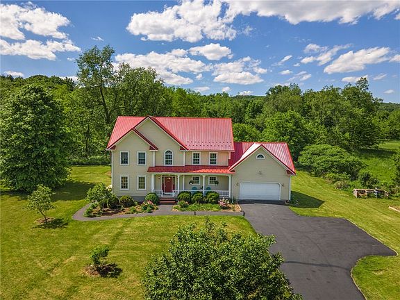 4.35 acre beautifully maintained home directly across from Treman State Park. Just a few minutes to downtown Ithaca this fabulous property has a creek, woods and meadow with private walking trails, but if you want more there’s another 1110 acres to hike at Treman. Simply cross the street to stroll to Lower Falls swimming hole. Home offers 3811sqft of with tall ceilings and windows. 2nd floor has 4 bedrooms and 2 full baths. 1st floor has a large eat-in kitchen with granite counters and brand new appliances, a sun filled dining room, living room, family room, a half bathroom and laundry room. The walk-out lower level has 5th bedroom and office (or another bedroom) plus a huge rec room and a storage room. Brand new metal roof, new lower level flooring and freshly painted interior you can move right in without any work. Separate lower level entry makes it easy to host extended family and guests. Set far back from the road you’ll enjoy privacy during your backyard events. Stunning sunset views. Follow the marked trail to the creek where there is level access for wading. Ithaca school district with Cayuga Heights elementary. Come see this gem. Open house June 1, Saturday 1-3pm.