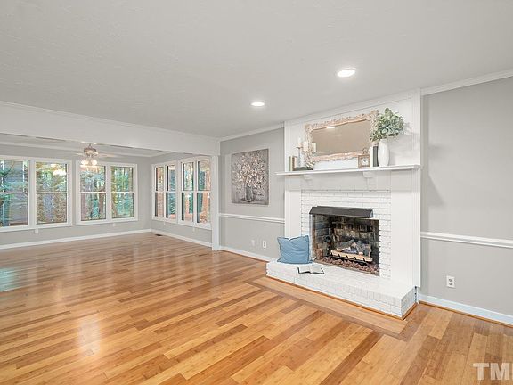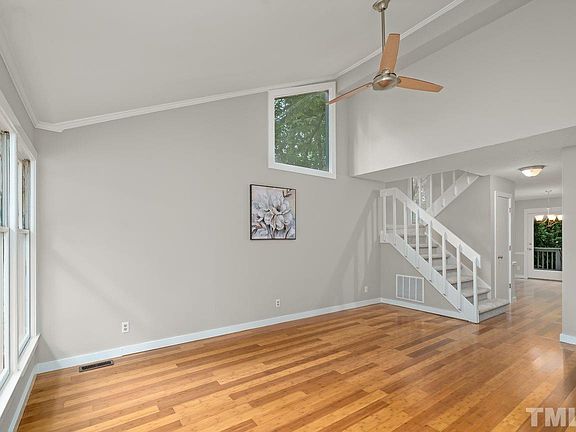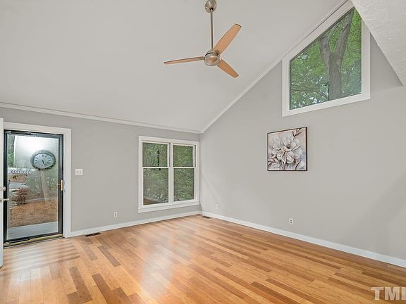 Modern architecture tucked away in the trees. This Cary gem has fresh paint as well as new flooring & fixtures. Enter through the great room w/ massive vaulted ceiling, then make your way to relax in the sun room or screen porch. Kitchen features GRANITE counters & a new tile backsplash, plus GAS stove! Retreat to the huge master and relax the night away. The feeling of secluded privacy w/ the convenience of the city! Trader Joe's & downtown Cary just minutes away!
