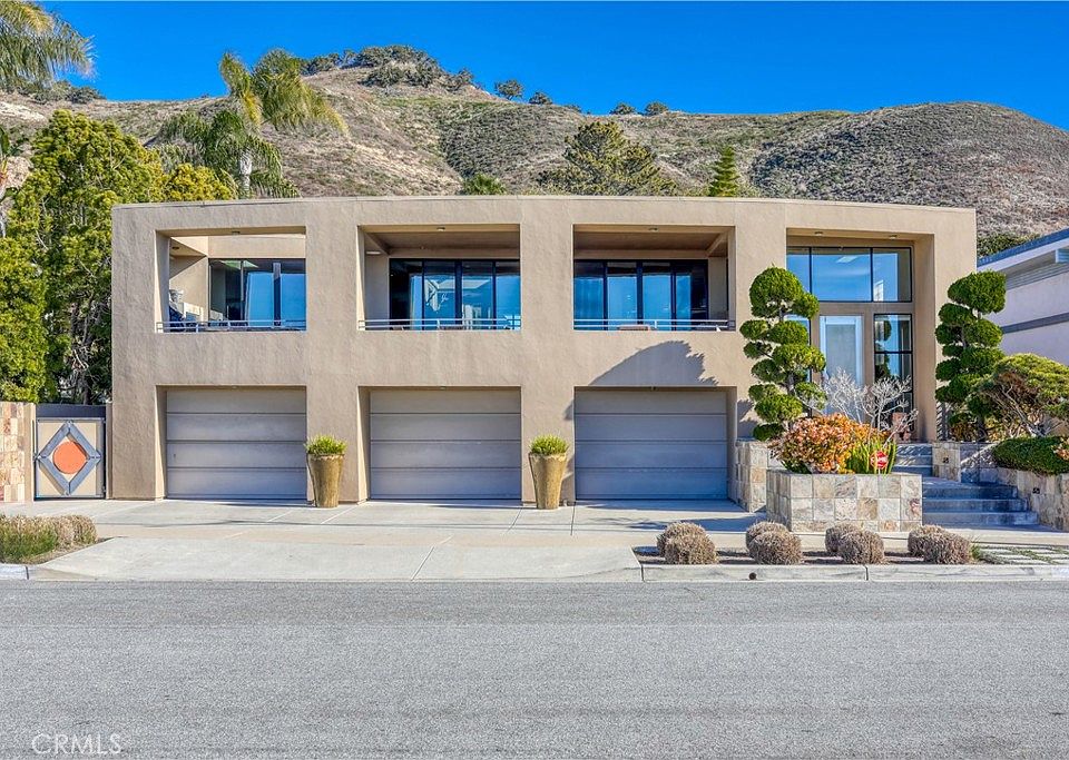 Magnificent custom home in highly desirable Sunset Palisades of Shell Beach, offers a unique blend of luxury and coastal living. With sweeping ocean views visible from nearly every window of the front of the house and the expansive deck, this residence is designed to capture the beauty of its surroundings. Upon entering, concrete stairs lead to the main level great room, featuring an open concept that seamlessly connects the stylishly unique kitchen, dining area, and living room. Three separate dual sliding glass doors lead from the living room and dining area to the front deck, providing an ideal space for alfresco dining or simply enjoying the mesmerizing ocean views. A hallway atrium leads to the office with access to a deck, the laundry room, 1/2 bath and the luxurious primary bedroom. The primary suite, sharing a deck with the office and another overlooking the pristine backyard, offers a retreat for rest and relaxation. The bedroom features a peninsula fireplace, a one-of-a-kind soaking tub, a separate walk-in shower, custom dual sinks, and a spacious walk-in closet. The lower level encompasses two additional bedrooms, one of which is currently utilized as a second office with sliding glass door access to the back yard. The bathroom on this level includes a dressing area, walk-in shower, and convenient access to the amazing backyard. The backyard is a haven of tranquility, featuring a beautiful fountain as its focal point—a serene space for gatherings with friends and family. The thoughtfully planned landscaping includes multiple seating areas, creating inviting spaces throughout. Plenty of parking and storage available in the oversized 3-car garage, with additional parking in the driveway. This home is a rare opportunity to live in one of the Central Coast's finest beaches, surrounded by great hiking and biking trails, proximity to world-class wineries, and enjoying the region's ideal weather. Don't miss the chance to make this exceptional property your coastal retreat.