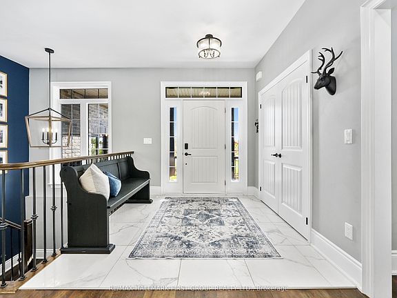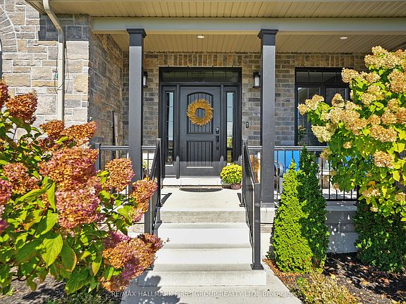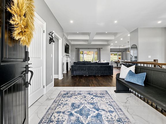 Modern elegance meets effortless entertaining in this stunning home set on 1.28 acres. Designed for entertaining, this home features in-ceiling speakers in the kitchen, living room, and outdoor area, and is wired for sound in the poolside bar, the perfect setting for gatherings both large and small. A covered front porch leads into an open entry where craftsmanship and attention to detail are immediately evident. Throughout the home, 8" baseboards, high ceilings, and upgraded window and door casements enhance the sense of space and sophistication. The living room impresses with its recessed waffle ceiling, crown moulding, custom built-ins with integrated lighting, and a beautifully detailed fireplace mantel. The open-concept kitchen offers ceiling-height cabinetry, under-cabinet lighting, stainless steel appliances, and large island with breakfast bar. The adjoining dining area features a recessed ceiling, ample room for large gatherings, and a walkout to the backyard. The primary suite offers a tranquil retreat with a tray ceiling, crown moulding, private walkout, walk-in closet, and a luxurious ensuite featuring heated floors, dual vanity with quartz counters, freestanding tub, and glass-enclosed shower. Two additional bright bedrooms and a full bathroom are situated on the opposite side of the home for added privacy. Completing the main level is a powder room, convenient laundry, and access to the double car garage with soaring 13' ceilings. The lower level expands the living space with a generous rec and media area, built-ins, a games area, guest bedroom, and full bathroom. Step outside to your backyard oasis featuring a fenced yard, sprawling covered deck with added privacy, landscaped patio, inviting inground pool, lounging areas, and a stylish pool house with bar and changing area. Ideally located just moments from amenities with easy access to Hwy 2 and the 401, this property offers modern design, thoughtful details, and resort-inspired living all in one.