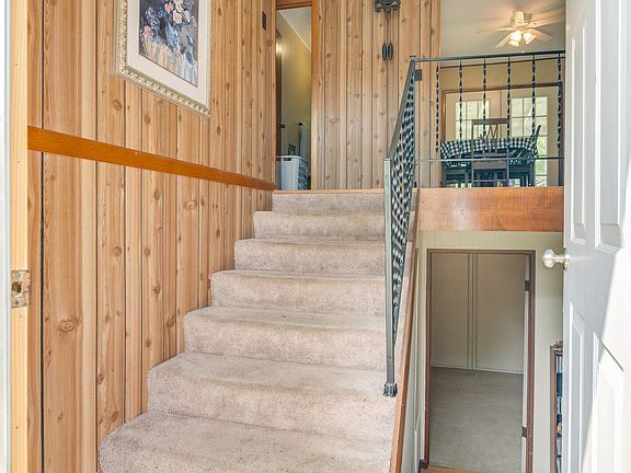 level ,sloping, and partly wooded with trails. lots privacy with extra 2 car carport and dome for storage plus large out building,+ workshop, The home features 2 fireplaces one in living area on main and one in den. Lots wood cabinets and bar in kitchen. Garage newly added. Landscaped with unbelievable large, length of home, back covered back porch to relax and enjoy park like setting.