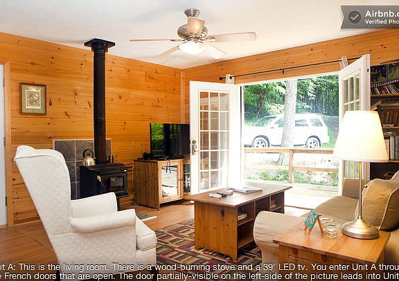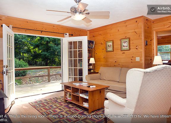 We have a 5-bedroom, 4-bath cabin in Lost River, WV. t is two levels with the bedrooms on the second floor. It's in the heart of gay WV and is a nice mix of local and DC weekenders. Here's the layout: *Unit A: 2 bedrooms and 1 bath. One bedroom has a queen-size bed. The second bedroom has two twin-size beds. *Unit B: 3 bedrooms and 3 baths. The master bedroom has a queen-size bed with a walk-out balcony. The second bedroom has a queen-size bed. The third bedroom has two twin-size beds. The sofa in the living room folds out to a full-size bed. We have a current Airbnb listing for our DC apartment and decided to try to rent out our WV vacation home. The cabin has a landline (shared between the two units) but there is no cell phone reception. We have high-speed DSL Internet as well as Hulu Plus and streaming Netflix. We're roughly 10 miles from Wardensville, WV and roughly 30 miles from Moorefield, WV. Moorefield is a good town for Walmart, lunch, and a movie theatre and bowling alley. Very close by are two restaurants: the Lost River Grill (5 miles away) and The Guesthouse Lost River (3.8 miles away). The former is more low-key, and the latter is a bit more upper-scale. Lost River Recreation Center (about 5 minutes away by car) provides a nice lake that you can walk around (and swim in during summer), a camping area, and a playground for kids.