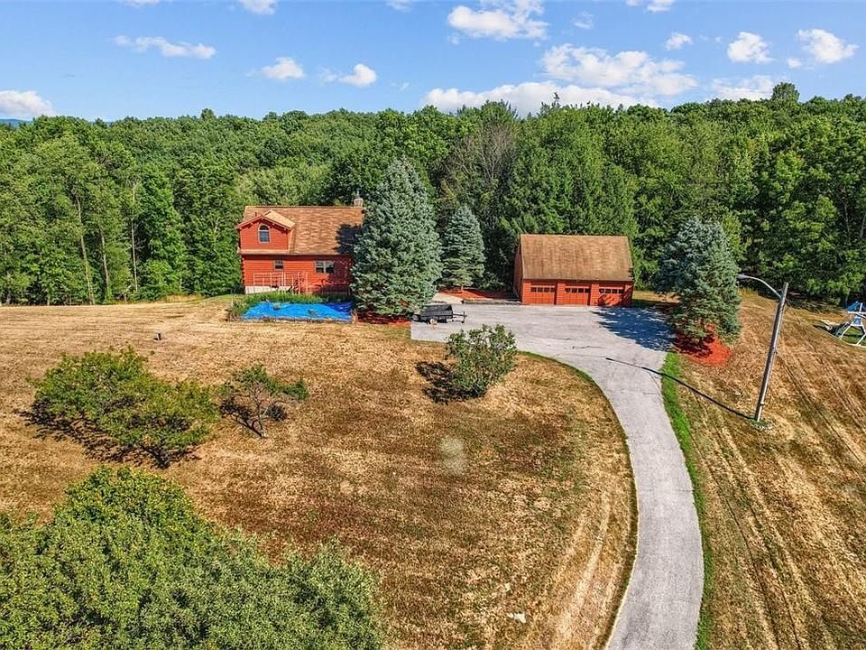 You will appreciate every blissful day in all four seasons of the year in this sweet and charming well maintained rural log home on 9 plus acres while preparing meals in the country kitchen including stainless steel appliances and overlooking the beautiful serenity of the Minisink area; fabulous energy efficient woodburning stove with expansive eye catching focal point fieldstone chimney heats the entire house which also features a 2nd level loft space off the upstairs bedroom; exposed beamed vaulted ceilings; Fujitsu mini split ductless air conditioning; wrap around deck where you can enjoy lovely views of the professional landscaping and lush surroundings including mature pines that stay green all year round. This private and rustic cozy retreat offers beautiful sunsets as nature abounds and would also serve as a wonderful weekend getaway escape where memories will surely be made. This home boasts a spacious and very functional detached 3 car garage for a workshop/storage/classic cars and with the added benefit of a roomy upper level unfinished loft which could be ideal for a music/art/exercise studio or home school/office. The home also highlights a full walk out partially finished basement. The Town of Minisink presents a picturesque and bucolic countryside for cross country skiing, fishing, wineries, breweries, fine restaurants, apple orchards, farm markets, hiking trails, horseback riding and only 15 minutes from Minerals Spa and wonderful ski resorts and shopping malls. Millenium Gas Company has pipe line right of way easement on property that is checked regularly and maintained by the company. 275 gallon above ground oil tank in basement. 11000 watt electrical panel wiring hookup for pigtail generator. (Generator not included) .. Upright freezer, chest freezers and air compressor in garage are not included in the sale. Refrigerator in basement stays. Two working wells on property. Trash pick up is private. Laundry room in basement. Additional Information: Amenities:Stall Shower,Storage,HeatingFuel:Oil Above Ground,ParkingFeatures:3 Car Detached,