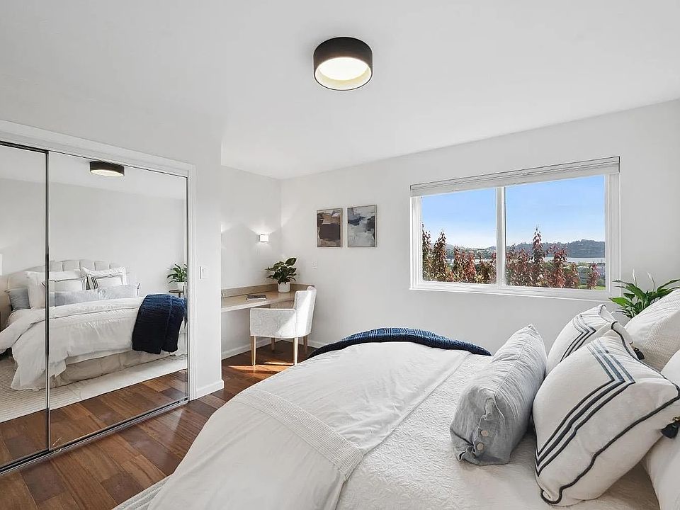 Experience peaceful bay-view living in this bright corner-unit condo in Sausalito. The open-concept layout seamlessly connects the kitchen, dining, and living areas, creating a spacious, light-filled environment enhanced by new double-pane windows. Step onto the private balcony to enjoy tranquil views of the Bay perfect for relaxing or entertaining. Inside, a stunning marble fireplace anchors the living room, while two generous bedrooms each feature ensuite bathrooms. Additional highlights include an in-unit laundry room, designated parking, and a private storage unit. The community offers resort-style amenities, including a pool, sauna, and remodeled clubhouse. Conveniently located near Highway 101, restaurants, shopping, and Martin Luther King Jr. Park with tennis courts, a dog park, and playground, this home blends comfort, style, and prime Sausalito living.