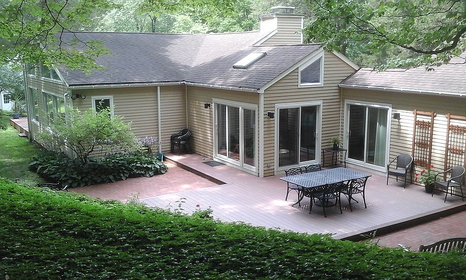 This is a home with style that is perfect for residents who want to celebrate the outdoors. The nearly five-acre property shaded by towering trees features a well-built mid-century home perched on a hillside above the Wickecheoke Creek and Preserve near Stockton. The expanded three-bedroom, three-bathroom residence offers a beautiful living room with tavern oak floors, a full-height stone wood-burning fireplace, and a southern exposure view into the woods from tall windows running the length of the home. A granite kitchen, spacious breakfast room and all-season sunroom are a few steps from the living area that opens to an expansive dining area that makes it perfect for entertaining. All bedrooms and baths are on the main level. The spacious principal bedroom, with new ensuite bath and walk-in closet, is in its own wing and has private access to the patio. A sunroom separates the principal suite from the main rooms and provides access to the spacious patio with two sets of sliding doors. Two additional bedrooms are on the opposite side of the house. One has an ensuite bath completely updated with a glass and tile shower and a free-standing soaking tub. The third bath has a large walk-in shower. Each of the main floor rooms have solid oak flooring. The lower walk-out level offers a large family room with terracotta tile floors and new custom French doors. The lower level also has a large laundry/storage room, an additional room currently set up as a workshop, and a unique dumbwaiter rising to the main floor. From this level there is direct access to the paved apron leading to a two-level detached and oversized garage and storage shed beyond. The extremely low-maintenance exterior has cement fiber siding and Azek® engineered polymer trim and moldings. The home can be entered on either level, with terraced gardens of perennials leading to a formal front entryway, and a secluded rear terrace connected to the sunroom. A separate additional deck adjoins one bedroom with a full-length patio door. In-ground lights lead to stairs to the lower level and the driveway. The secluded property feels like it is in another world but is less than two miles from the center of Stockton, and only minutes from Lambertville and New Hope. Proximity to the Creek, the Preserve and the nearby seventy-mile-long Delaware and Raritan Canal offers easy access to outdoor exploration. The fully paved driveway connects to Lower Creek Road, providing easy access for walking, biking, hiking right out your front door. This scenic road exits at one end near the Prallsville Mills and at the other, next to the only remaining covered bridge in New Jersey.