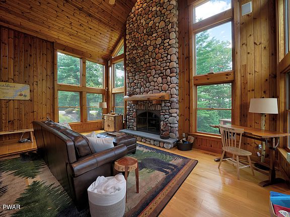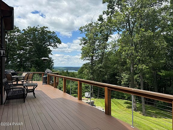 Lake Wallenpaupack Home in Whispering Pines with Boatslip & Lake Views! This exquisite home, located in the serene Whispering Pines community, offers everything you need for a perfect getaway or year-round living. Situated on a private cul-de-sac, this property boasts 1.95 acres of picturesque landscape and breathtaking lake views. The home features three spacious bedrooms plus a loft, three full baths with modern amenities, and high ceilings in the living and dining rooms, creating an airy and expansive feel. The full finished walk-out basement includes a family room with a cozy fireplace, wet bar, game room, and a dedicated hot tub room. Outdoor living is enhanced by a large deck for entertaining, a patio for relaxing, and a basketball court for sports enthusiasts. Additional amenities include an attached garage, paved driveway, and a charming covered front porch. This home also comes with a coveted boatslip, providing easy access to the stunning Lake Wallenpaupack. Whether you're looking for a peaceful retreat or an active lifestyle by the water, this home offers the perfect balance. Don't miss out on this rare opportunity to own a piece of paradise in Whispering Pines!