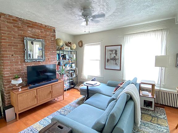 The unit features a spacious living room with hardwood floors, a decorative fireplace, and plenty of natural light from three front-facing windows.