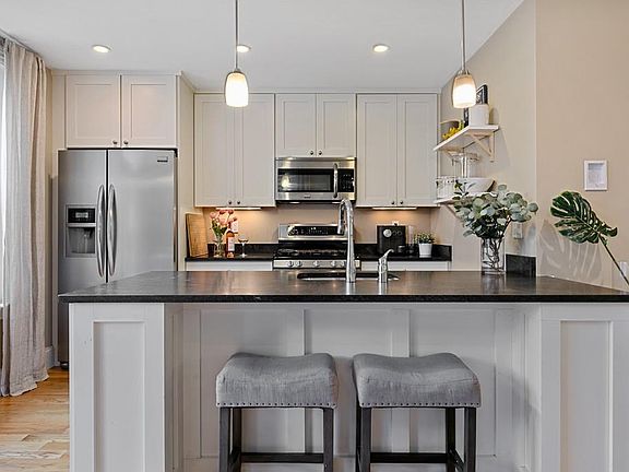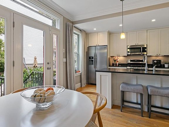 Marine Road, one block from the beach in a very desirable area of South Boston presents this 2 bed, 2 bath, 1,517 square foot fully renovated home with fenced-in private garden / patio, high ceilings, and abundant storage. Two very large bedrooms, one with en suite bath and walk-in closet, and the other just off the main living area, create a modern and functional duplex with recessed lights, central air, separate laundry area, and office nook. The cook's kitchen is perfectly sized, and offers a breakfast bar open to the living / dining / entertaining areas. The rear wall of glass offers great light and views to the private oasis patio for al fresco dining, pets or children.100% owner occupied, 2 unit association. Move right in!