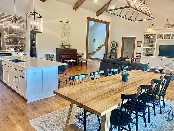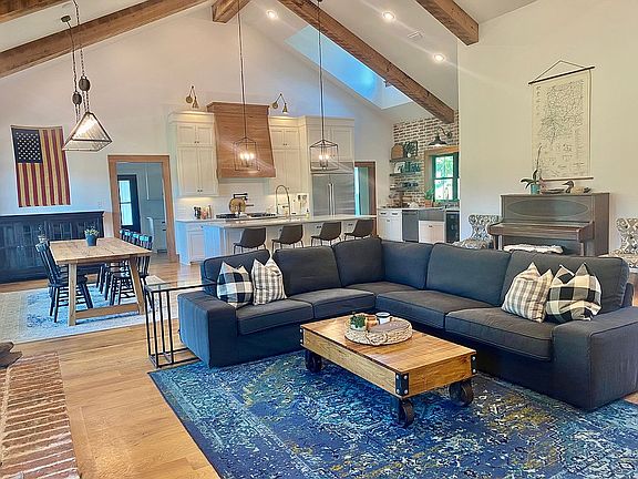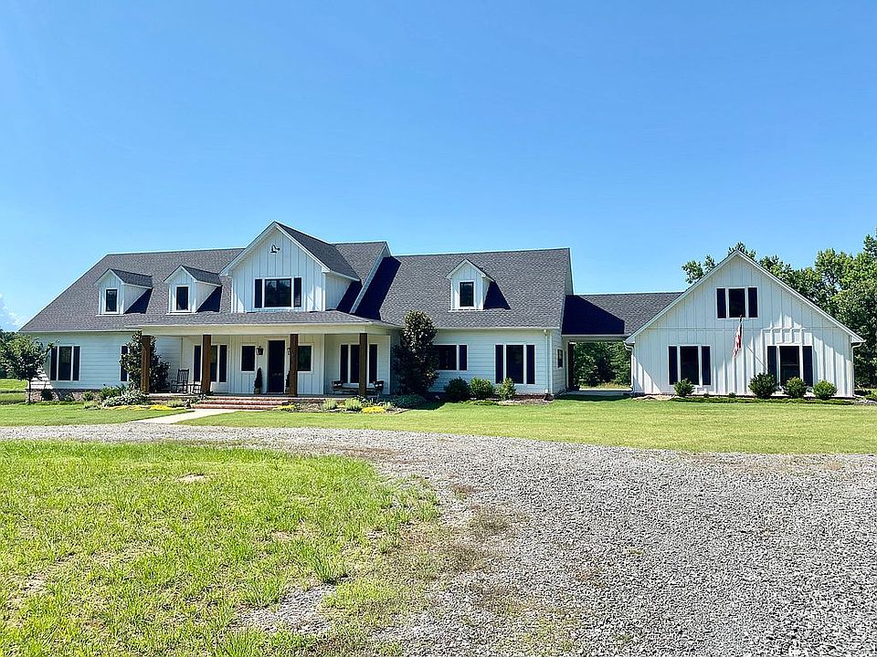 This is an incredible 4 Bed 3.5 Bath farmhouse homestead housed on 21.73 acres of pasture land and wooded bottoms with a 3 acre pond. It has a gambrel-style red barn/shop with income property attached. From the graveled driveway to the covered front porch you’re welcomed inside to an immediately impressive open plan with gorgeous white oak floors and tall beamed ceilings. To the right of the foyer through the reclaimed antique door is your office with custom cabinetry with the Murphy desk style craft table & built-in work space. Enter the great room with the vaulted 100 year old wood beamed ceiling and wall of windows giving great natural light. Your hearth room has the first of two floor to ceiling brick, gas starting, wood burning fireplaces, plus the great entertainer built-ins. Your chef’s kitchen highlights a gorgeous quartz breakfast island with the oversized under mount sink, premium appliances, custom wood wrapped vent-a-hood, and bonus wet bar with the apron farmhouse sink, beverage cooler, nice exposed brick backsplash, and double dishwashers - perfect for entertaining. Your spacious dining is wrapped with windows that give access to your beautiful veranda that has the 2nd gas fireplace with the awesome vaulted sitting area, outdoor dining space, outdoor shower setup, and gorgeous views over your pond and acreage. Through the sliding pocket door off the kitchen is the bougie butler’s pantry with floor to ceiling storage, including the appliance garage. This flows nicely into the mud room / laundry with the built-in locker storage and convenient half bath. Down the herringbone hardwood hallway on the main level is your sizable Owners’ suite wrapped with windows that open to your private covered patio that overlooks your stocked pond, plus the oversized bath that has the black hexagon tile, free standing 2-person soaker tub, double seated walk-in rain shower, and double sliding barn doors to the two walk-in closets (one of which serves as an F5 Rated true safe room). Also on the main level is your additional 2 beds with built-in work stations. Nestled between is a Jack-and-Jill bathroom with double walk-in closets, double vanities, and vintage claw foot shower/tub. Take the open stairwell to find your rec room / play area, plus the additional guest bed & bath, and ample storage spaces. Your oversized 2 car rear entry insulated garage is attached by the porticochere, giving a nice breezeway between the structures and plenty of space for RV or boat parking as well by the yard that’s electrically pre-plumbed for a pool install. On the other side of the garage is propane hookup for generator supply most of the house in an outage. On the other side of the property is a custom, Gambrel-style metal framed barn/shop with its own 2 beds & guest bath, perfect for income property or mother-in-law suite. Enter at the open kitchen with the ship lap walls, butcher block counters, farm sink, and walk-in pantry. Through the sliding barn doors is the laundry setup. The two beds have a Jack & Jill to share the double vanity bath. Step through the hunter’s closet to enter your studio office. Your shop section is cooled by the Big A$$ brand fan & lit by Big A$$ brand lights with the half bath, plus the three bay lean-to for all your farm equipment & recreational toys. You can't miss the stair access to your ample additional storage at the floored attic above the garage. We’re excited for you to come and see if it's yours. Welcome home!