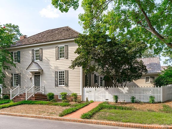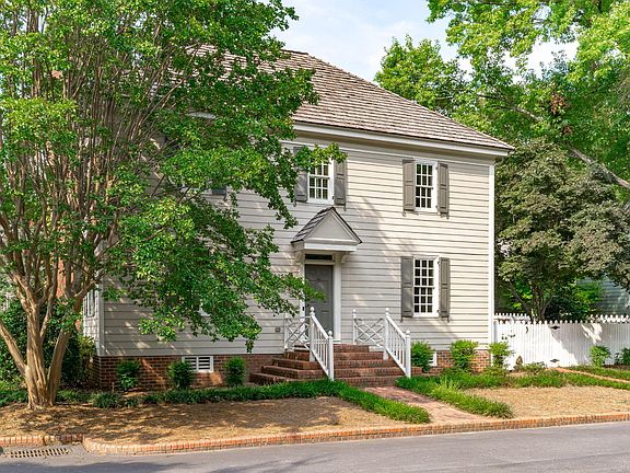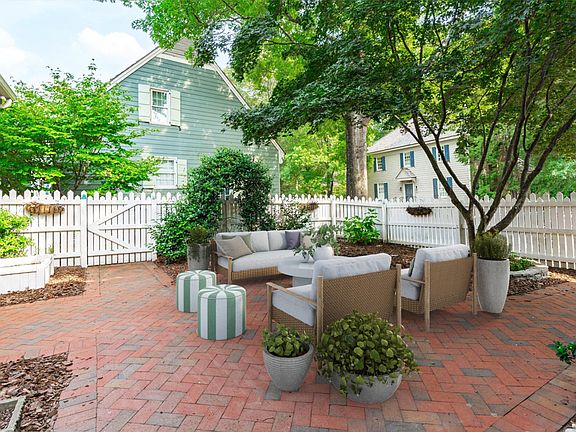 Williamsburg Commons- arguably the most charming boutique neighborhood in Cary, NC. Designed by William Poole- to mimic the beauty and authenticity of Colonial Williamsburg's Robert Carter House with cedar shake roofs, brick lined streets, mature trees, picket fences & colonial lantern posts. Conveniently located in the heart of Cary and walking distance to coffee shops, grocery stores, restaurants, Lochmere golf course, Hemlock Bluffs nature trails, Ritter Park and more. This home, one of the largest in the neighborhood, offers a first-floor primary suite, vaulted ceilings, heart of pine floors, and an updated gourmet kitchen with Thermador Pro gas range. The romantic courtyard garden is complete with brick pavers and picket fencing, perfect for alfresco dining and entertaining. The second floor provides an array of layout options for multiple bedrooms, an office, playroom, gym, or work studio. Additional features include an oversized 2 car garage, new windows and plantation shutters, water filtrations system, new carpet, private deck off primary bedroom, new fully encapsulated crawl space and more. Additionally, this home faces the dedicated neighborhood green space for unobstructed views of the nature preserve and ample grassy acreage for play. What's better, HOA handles all landscaping. That includes all community shared space AND individual homeowner yards.
