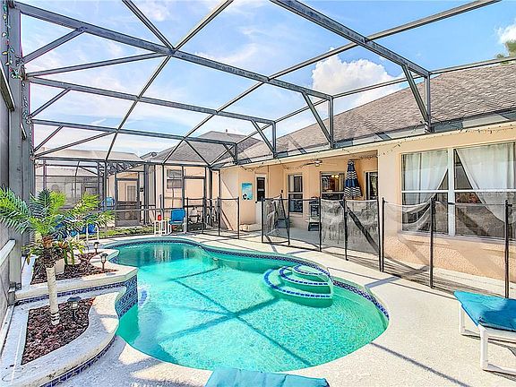 This very attractive, furnished vacation pool home is located in the much sought after Calabay Parc community in the Four Corners area of Davenport. Its close proximity to the ChampionsGate area and access to I-4 and Hwy 192 ensures easy access to the Orlando and attractions areas for work or leisure including the theme parks, shopping, restaurants & golf courses, as well as the beaches on both the Gulf and Atlantic coasts. The spacious living room opens onto the pool deck. The kitchen is fully equipped and has a well-sized dining area that also opens up to the pool deck. The master bedroom has an en-suite bathroom which features a garden tub and separate shower stall. All 3 bedrooms are well proportioned. The fully screened pool deck with covered lanai has a fence which runs along the back of the property providing greater privacy to the pool area. You will absolutely love your private Oasis with plenty of room for relaxing and sunning while listening to the waterfall feature. Entertain and enjoy the Florida Lifestyle year round with the Solar AND Gas heated pool. The pool area even has a separate bathroom for your added convenience! Short-term rentals and AirB&B's are allowed, use as a second home or primary residence. Neighborhood is fully equipped with a Webcam Observation Facility that allows property owners view any part of the community "live" 24/7. HOA includes Lawn Maintenance/Irrigation, Exterior Pest Control, Trash Collection & Tot Lot Play Area. Hurry this will go fast!