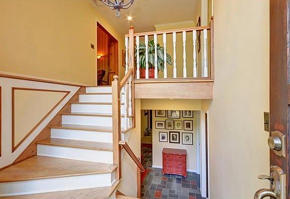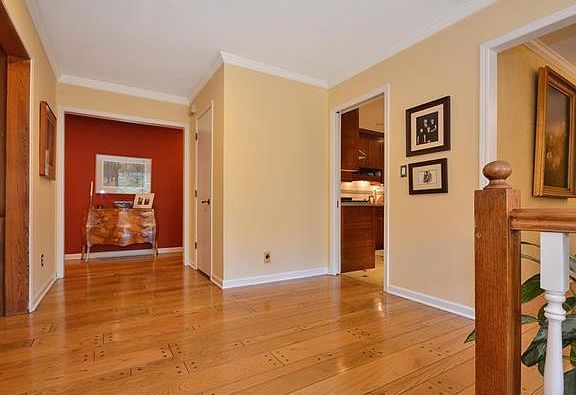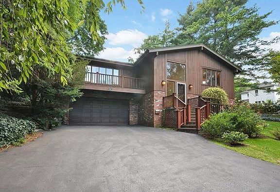 Bright and spacious Contemporary raised ranch on private 1/2 acre in wooded surroundings. This home features a large foyer, beautiful large living room with door to deck and back yard and a large bright formal dining room. Renovated Eat-In-Kitchen with door to deck and large back yard. Master bedroom with en suite bathroom and additional 2 bedrooms and hall bath. Den/office with fire place on the lower level, bedroom, bathroom, and large family room. Utility and storage room. Easy walk to Village, train, bus and Hyatt Park Field and playground.