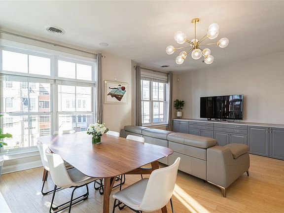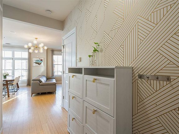 Vibrant, rare and custom Desirable true 2 bedroom/2 bath + bonus den/office/nursery that can easily fit a twin or full bed and be converted into a 3rd bedroom. Located in Liberty Harbor, this unique corner end unit provides 360 panorama angles of windows throughout the entire 9ft high ceiling unit offering an abundance of sunlight while maintaining privacy. Modern and contemporary kitchen includes Viking stove +more aside an open floor plan offering a generously large living and dining area with gleaming bamboo hardwood floors throughout. The living room includes a beautiful custom media console . The two bedrooms are extra large in size and are separated by the common full bathroom. The master suite is oversized including two large half walk-in custom closets and full master bath with custom marble double vanity. The unit also features custom ceiling speakers in the living room, kitchen and bedroom. Large laundry room includes full size washer/dryer with extra storage space. Conveniently located off of Grand Street, known for the large beautiful post street lights with a charming ambiance, offering just a quick 15 minute commute to NYC. Walking distance to Grove Street path station, all major shops and restaurants along with the top rated Montessori school, pool, fitness center and indoor parking garage. This amazing home has the charm and aesthetic of a Townhouse with high end finishes including custom wallpaper, kitchen, closets, security + more . Low HOA and taxes!