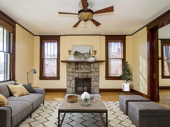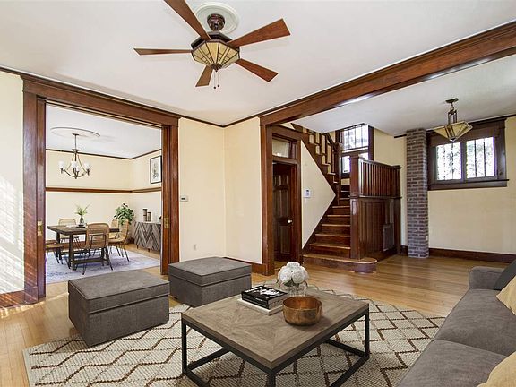 So much character in this 100 year old home! Open floor plan w/ a fantastic entryway & living room that opens into the large dining area. Kitchen has been updated w/ granite countertops & additional cabinet space. Downstairs "inlaw suite" or office. Upstairs master w/ ensuite, a large additional room w/ sitting area or nursery & third bedroom & a guest bath. Hidden bonus/playroom on third floor. Beautiful landscaped backyard w/ wood fired pizza oven & 2 outbuildings that could be an office or yoga space!