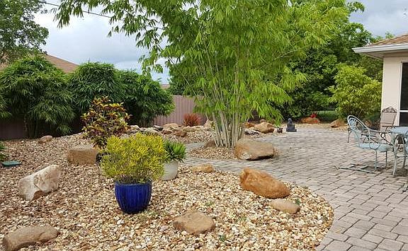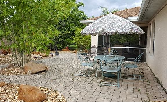You will love the curb appeal with tropical landscaping the minute you pull up to this home. Through the double-door entry, you'll love the open floor plan with french doors to a separate den/office, eat-in kitchen with huge Island, and great room with vaulted ceiling. But you will say 'SOLD' as soon as you see the back garden! This serene setting begins on the screened lanai. You will see an Asian inspired garden with lovely babbling brook for relaxation, bamboo for privacy from all your neighbors, and Asian statues to complete the 'Zen' feeling. It's even low maintenance! Lovely and clean house in desirable SW Cape Coral neighborhood! Central location close to shopping, restaurants and Cape Coral High School. Easy commuting from Veteran's Pkwy to Ft. Myers. 3 bedrooms + den, 2 bath, 2-car garage, Kitchen open to family room, carpet/tile throughout. Separate formal dining. Vaulted ceilings. Wood cabinets in kitchen. The master is separated from the guest bedrooms and has a large adjoining bathroom. Master bath has a large soaker tub, and separate large walk-in shower. Furnishings are negotiable. Southern rear exposure. Don't miss this one! It will go fast!