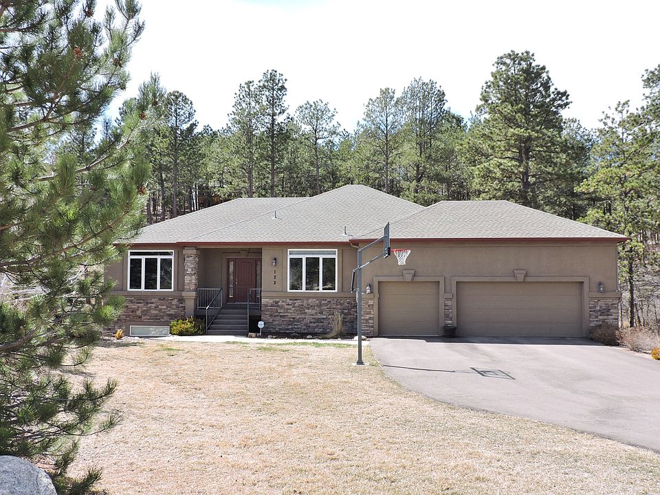 Stunning custom ranch style home nestled in the towering pines of Timberview. Splendid attention to detail makes this home a true gem. Features include; Welcoming entry with hickory wood floor that flow through most of the main level. Gourmet kitchen loaded with convection double oven, 5 burner gas cooktop, granite counter, center island, pendant lighting and open breakfast nook that walks out the deck. Elegant dining with coffered ceiling, warm and inviting great room w/ gas fireplace, private main level office w/arched built-ins, spacious main level master suite and adjoining five piece master bath, jetted tub and walk in shower w/ body jets. Lower level features a walk-out family room, wet bar, stacked stone gas fireplace, three spacious bedrooms, three baths and storage area. Dual zone heating, two hot water heaters, A/C, central vac, humidifier, wired for home audio, deck stubbed for gas, professionally landscaped, flagstone patio and walkway and newly finished driveway. Located on a quiet cul-de-sac, this home is a magnificent find!