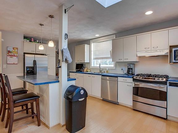 Here is a great house within walking distance to all that Bedford Center has to offer, as well as Springs Brook Park, Patriot Golf course, and close to the Minute Man Bike Path too! The enclosed porch/mud room offers convenience, while also welcoming you inside this two-story home with wood floors throughout. The kitchen is spacious and has stainless steel appliances, a center island with chic pendant lighting, skylight, and a glass door that leads to the large deck. The large low-maintenance deck has a hookup for your gas grill and there is also a stone patio and shed in the fenced backyard. Back inside, the dining room with built-in hutch is open to the kitchen, and both the kitchen and dining room have wainscoting. The main level also provides a family room, bedroom (or office), half bath and laundry room. Upstairs are 3 bedrooms with hardwood floors including the master with walk-in-closet, and an updated full bathroom. Move right in and fall in love with your home and community!