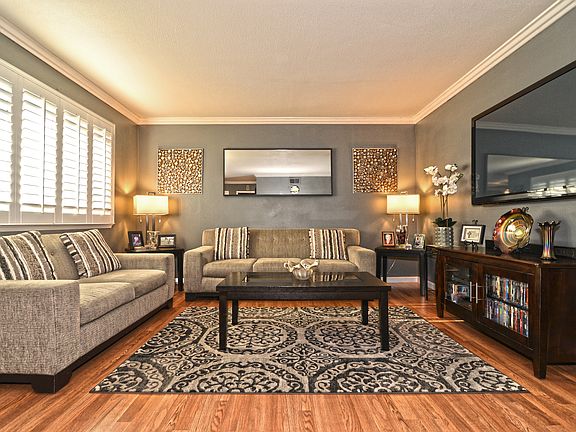 Spacious and beautiful! Come up your private entrance to your entrance to this upgraded end unit with 2 large bedrooms, 1 bath, 1 car garage! Over 950 sq ft of living space. Great large balcony off the dining area. Open floor plan with large living room, designated dining area, crown moulding, newer Milguard dual pane windows, plantation shutters beautiful laminate flooring. Kitchen include gas stove, ceramic tile flooring and breakfast bar for your morning coffee! Central air and heating. Large master bedroom with walk-in closet and organizer. Ceramic tiled bathroom and ceiling have been scraped smooth! Separate laundry area for the condo unit of four located just under the unit. Conveniently located near schools, parks, shopping and freeway.