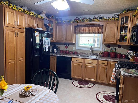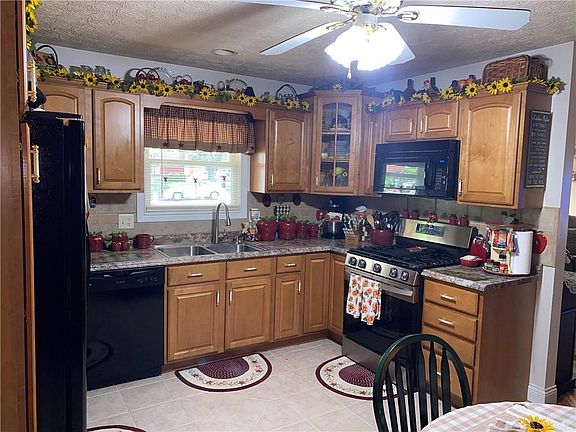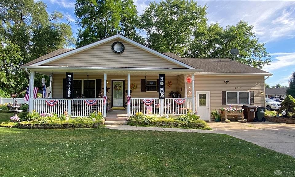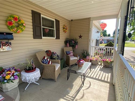 Beautifully landscaped and Move-In Ready! This Charming 2 possibly 3 bedroom/1.5 bath features 1450 sq ft of living space. Built in 2001, this home welcomes you with a 29x9 covered porch! Upon entering you will find a large living room with new wood laminate flooring which flows into the hall and 2 bedrooms. The primary bedroom features a 1/2 bath and large walk-in closet. Updated main bathroom with tile floors. Beautiful eat-in kitchen w/ tile flooring and backsplash. Of the kitchen and in the lower level you will find a 20x20 3rd bedroom/rec room or whatever you desire to use it for. This area provides closets, added cabinet space, Portable Gas fireplace, and new carpet. Outside you will find a detached garage and 2 storage sheds. Act Fast!
