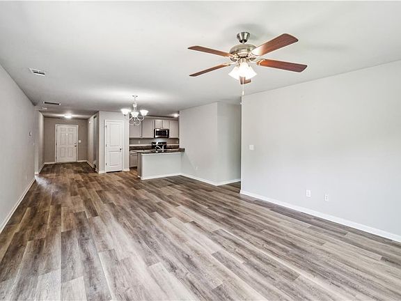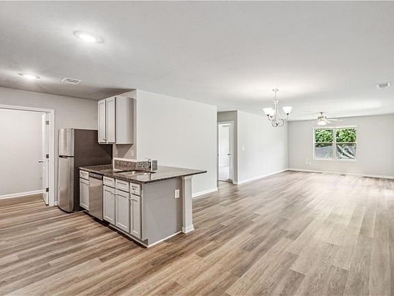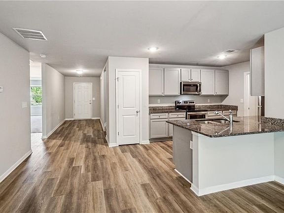 Open-concept layoutStainless steel appliancesStylish kitchenPantry closetGranite countertopsGrey cabinetryLow-maintenance yard