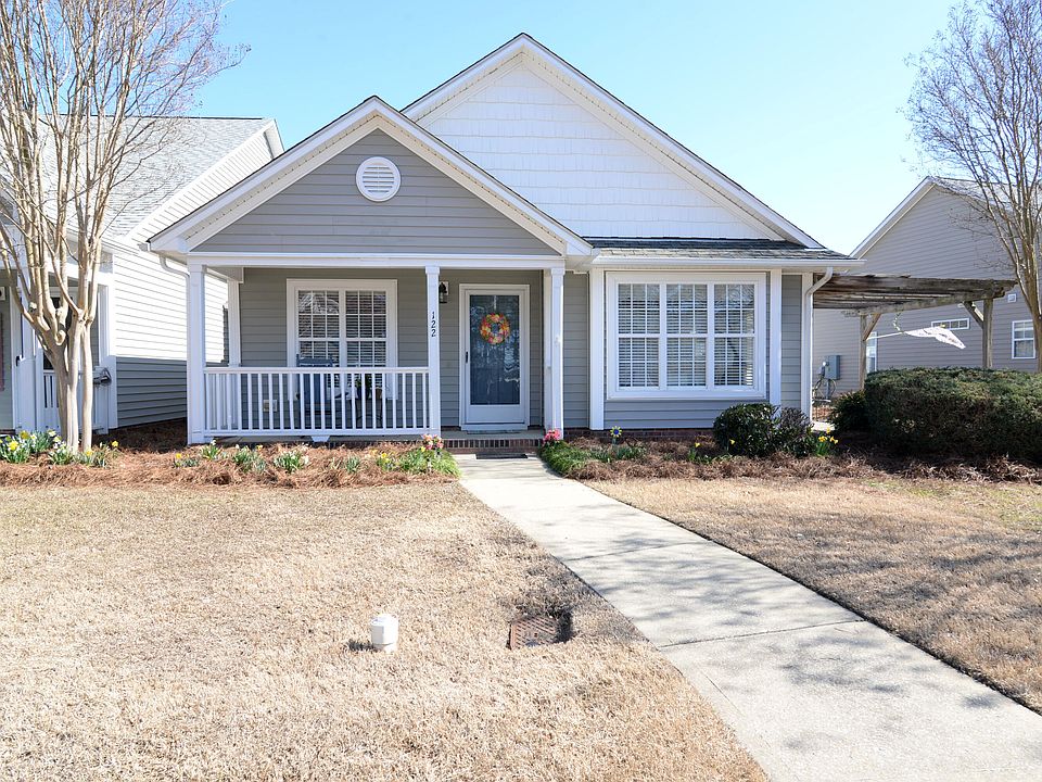 Move in Ready! 3 Bedroom - 2 Bathroom end unit townhome with private back yard and detached garage/workshop! Conveniently located to all major roads, shopping, restaurants, hospital, and recreation park. Features include vaulted ceiling and gas logs in living room - Hardwoods throughout main common areas. Large primary bedroom with dual vanity sinks, walk-in closet & walk-in shower. New HVAC in 2021. Refrigerator included. HOA includes exterior maintenance and lawn care.