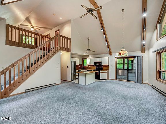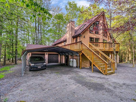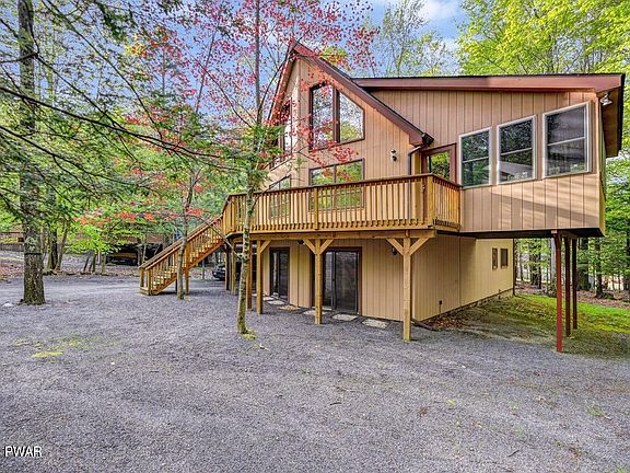 Cozy chalet home, just a 10-minute walk from its included boat slip on Lake Wallenpaupack! The main level of the home features a welcoming living room with a brick fireplace, a dining area, and kitchen boasting a pantry and newer refrigerator. It also houses a large master bedroom with vaulted ceilings and skylights, an additional bedroom, full bathroom with a handicap-accessible shower, and sunroom. The upper level features a loft-style bedroom with a walk-in closet and a full bathroom. The lower level offers a semi-finished space, with a large family room and a versatile bonus room. This level also includes a full bathroom with a tub and a convenient laundry room. Recent upgrades include the replacement of upper-level windows, deck and the roof. Exterior amenities include a wrap-around deck, two-car garage, a separate carport, and a storage shed, ensuring ample space for vehicles and outdoor equipment.
