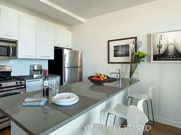 Immaculate one bedroom / one bath apartment is now available for rent in the renovated Pencil Factory Condominium on the Greenpoint waterfront. Soaring 10 foot ceilings and generous size windows enhance this fabulous prewar loft building built in 1872 and converted in 2009. There are hardwood floors throughout, and a kitchen with spotless white cabinets and stainless steel appliances which opens out to the living / dining room. The bath has gray tile work, vessel sinks, and soaking tubs. A washer-dryer is in the apartment and there are abundant closets. A club room, lounge with pool table, bike storage and gym are available with the apartment at no extra fee. Parking and a storage unit are both available for rent. The Pencil Factory Condominium features a virtual doorman and storage room for package deliveries. The icing on the cake is a fabulous communal roof top deck with spectacular East River and Manhattan Skyline views at any time of day. The East River Ferry is just steps away. The G train is just two blocks away