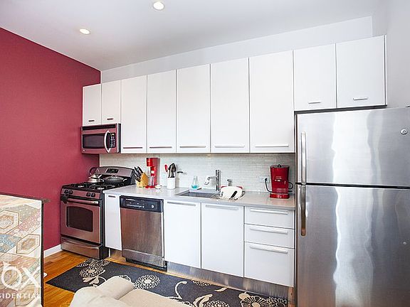 Immaculate one bedroom one bath apartment is now available for rent in the renovated Pencil Factory Condominium on the Greenpoint waterfront. Soaring 10 foot ceilings and 4 generous south facing windows enhance this fabulous efficiently laid out prewar loft apartment. There are hardwood floors throughout. The kitchen has spotless white cabinets, Italian marble back splash tiles, Caesarstone quartz countertops, stainless steel GE appliances and opens out to the living / dining room. The bath has gray porcelain tile work, vessel sinks, and a soaking tub. The bedroom features an entire wall of built-in closets. There is a washer-dryer in the apartment and a huge private storage unit that comes with the apartment. A club room, lounge with pool table, bike storage and gym are available with the apartment at no extra fee. Parking units are available for rent through management on a first come first serve basis. The Pencil Factory Condominium features a virtual doorman and storage room for package deliveries. The icing on the cake is a fabulous communal roof top deck with spectacular East River and Manhattan Skyline views at any time of day. The East River Ferry is just steps away. The G train is just two blocks away Tenants are not permitted to have dogs. No smokers please.