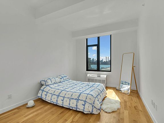 Welcome to 122 West St #4C, a loft-like condo unit with river views, approx 800 SF. The living room and bedroom both face West with views of Manhattan and the East River through oversized windows. Bedroom easily fits a king size mattress. High ceilings, hardwood floors, and an in-unit washer-dryer. The kitchen boasts a large island, quartz countertops, SS appliances, dishwasher, microwave, and gas range. The newly retiled bathroom has a deep soaking tub. Apartment has two PTAC units for cooling and heating.