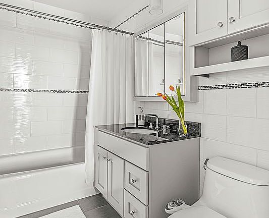 Unit 5H greets you with an open living and dining floor plan and oversized windows that invite sunlight all day long. A substantial kitchen workspace with silestone quartz countertops and recently purchased Bosch dishwasher, combined with lengthy bar seating allows for a flexible living/dining layout and is perfect for entertaining. The generously sized, river-facing bedroom enjoys a giant walk-in closet with custom shelving. Situated next to the living room is a comfortable home office, providing a clean separation from sleeping quarters. The renovated bathroom is complete with a deep soaking tub and storage vanity, and is delineated by a transitional hallway with an Asko washer, recently replaced Bosch dryer, and linen closet. There is a new PTAC unit in the living room, all new windows recently installed, as well as new trim around windows and doors,