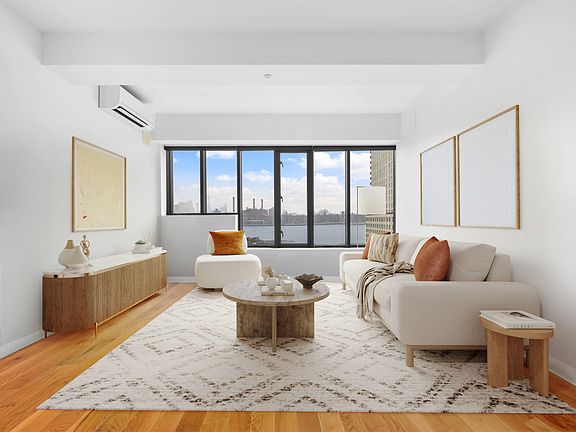Command the views in Unit PHF at The Pencil Factory Condominiums, a 2-bedroom, 2-bath penthouse in a full-service elevator building on Greenpoint's waterfront. This sun-filled home boasts an ideal split-bedroom layout, with the primary suite (complete with en-suite bathroom) separated from the 2nd bedroom by the spacious main living area. Highlights include floor-to-ceiling windows, soaring ceilings, oak hardwood floors, a sleek stainless steel kitchen with upgraded high-tech refrigerator, split-system heat & A/C, abundant closet space, and an in-unit washer/dryer. The star of the show? A private 400 sq ft terrace with jaw-dropping views of the NYC skyline and East River. About the Pencil Factory Originally built in 1872 for the Eberhard Faber Pencil Company and transformed into one of Greenpoint's premier luxury condominiums in 2009, the building offers an array of modern amenities, including: Virtual Doorman - Fully automated entry system with package room Full-Time Super Resident's lounge and newly renovated fitness center Children's playroom and additional lounge (party room) Free bicycle storage Common roof deck with restroom and panoramic city & harbor views Parking available for an additional fee and waitlist. Prime Greenpoint Location Set on the Greenpoint waterfront, you're just 1 block from the Greenpoint Ferry landing and 2 blocks from the G train for an easy commute. Transmitter Park is right outside your door, offering a pier, scenic walks, and summer movies on the lawn. Surrounded by an ever-growing collection of cafes, boutiques, bars, and restaurants, this location offers the best of Brooklyn living. Credit check fee: $20 per applicant Once approved by the owner (Condo Board Application fees): $350 Submission Fee $75 Application Initiation Fee Once approved by Board: Non-refundable move in fee of $400 REFUNDABLE deposit of $1000 1st month and security deposit equal to one month's rent each due at lease signing Some photos are virtually staged