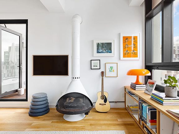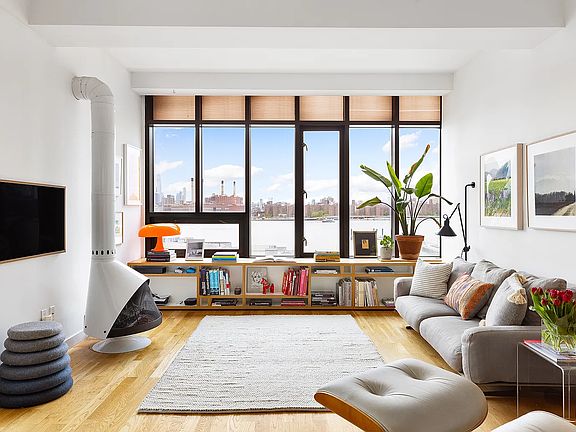 Penthouse G in The Pencil Factory is situated on iconic West Street in Greenpoint. It is a true two-bedroom, two-full-bathroom home with two large private terraces facing Manhattan. This light filled home offers some of the best views in Brooklyn, facing South, West and North! As you enter this serene abode through a well-appointed foyer stacked with storage options, you are first welcomed by a warm and modern open-layout kitchen. As you turn toward the living space, you are struck by the stunning views around you. Your eyes are instantly drawn past the large dining room area and living room out through the oversized windows where they meet the East River and Manhattan views. Two decks flank the apartment and both have been meticulously finished with Ipe inlay decking with a paved board and adorned with self-irrigating planters. In the living room, cozy up with the custom-made, gas-burning fireplace - a truly unique feature of this home. Enjoy dinners and friends al fresco, on one of two decks from which you can face the northern Brooklyn cityscape or the western sunsets over the city skyline. On either side of this winged home, you'll enjoy full privacy with two separate sleeping quarters. The primary bedroom features an extra-long double closet, an en-suite bathroom with a rain shower and deep-soaking bathtub, as well as additional space for an office or reading nook. This room also has access to the western deck and overlooks the water and Manhattan. The second bedroom is spacious and also features oversized windows with great views. Adjacent to the secondary bedroom is a full bathroom with a soaking tub. In the adjoining hallway, you'll find a large outfitted closet as well as a washer and dryer. From custom built-ins to beautifully finished terraces and a gas-burning fireplace, the attention to detail resonates in this well-appointed home. Penthouse G can convey with one parking space; available for an additional fee - please inquire. The Pencil Factory Condominium Building features a beautifully designed and furnished common roof deck, a recently upgraded gym, children's playroom and lobby, a package room, a party room, a virtual doorman system, a full-time super, and bike storage. Storage units can be rented from the building (subject to availability). Pets are welcome. Known for its foodie and coffee options, you won't be lacking in this Greenpoint spot. Close by you'll find Bar Americano, The Moonlight Mile, Pencil Factory Bar, Rhythm Zero Coffee Shop, and Naked Dog to name a few! For Parks and nature lovers, you have WNYC Transmitter Park down the street along the waterfront and the American Playground two blocks away. You are also a short distance to the East River Ferry and three blocks to the G train, making your commute easy.