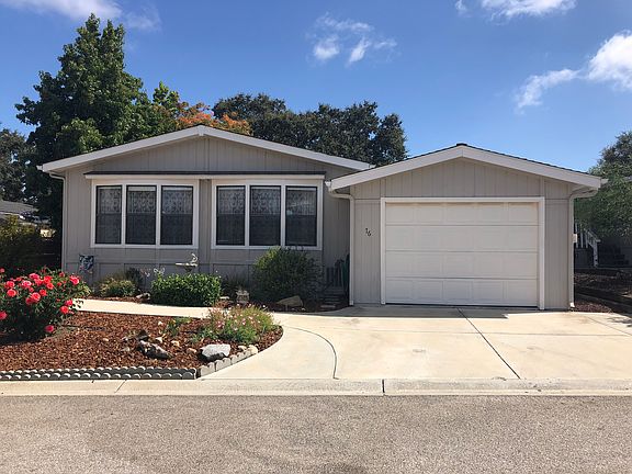 CONTACT: phone (805) 459-5961 or email mgarrick46@gmail.com · Re-modeled and updated home on beautifully landscaped lot with mature shade trees and gorgeous garden areas in an all-age mobile home park · 3 BD/ 2 BA with 1248 square feet of living space · Monthly rent will be $392 upon occupancy by the new owner · New sculpted carpeting in living room and master bedroom · Completely re-modeled kitchen with LG Max solid surface countertops, shaker style hardwood doors and drawer fronts, cast iron double sink, pull-out faucet, mosaic tile backsplash and stackstone wall coverings. Flooring is wood-look in excellent condition · Interior completely re-painted · Both bathrooms have newer cultured marble sinks and newer faucets. · Master bath has new laminate flooring. · Deck measures 15x27 feet with nice views of oak trees and Templeton hills. · Porch and deck have been re-furbished including solid color staining. · Garage is oversized to 14x24 feet and easily houses a full-sized long bed crew cab pick- up truck. The driveway accommodates parking for two additional cars. · Very nice window coverings throughout which are included · Refrigerator as well as washer and dryer are included · Free standing wood burning fireplace · New HVAC system two years ago NOTE: Potential buyers are requested to obtain a letter of pre-qualification from their lender to be submitted concurrent with any offer to buy. CONTACT: phone (805) 459-5961 or email mgarrick46@gmail.com