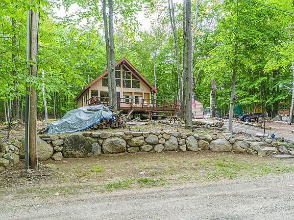 Chalet style cottage which has been nicely updated & is located in a cul de sac near the community center and golf course. The cottage has distant lake views from the deck. There's a cool fire pit in the front yard and shed on the side yard. Enter the cottage via a side door, on the walk around deck, or sliders. The vaulted & beamed LR has an 'old fashioned' red wood burning fireplace BUT HVAC wall unit has been newly added ( heat & AC) Many windows allows the sunshine in....new laminate floors throughout the 1st floor. The main floors consists of the LR, dining area, kitchen, 2 bedrooms and a bath. A large open, sleeping loft is upstairs. Stackable washer/dryer. Bedrooms on main floor have electric baseboard heat. Electrical has been updated.HVAC added 2018. Sale includes 4 seat golf cart and furniture.