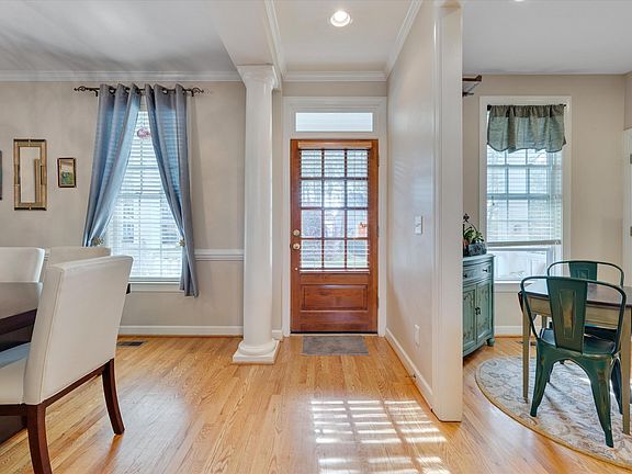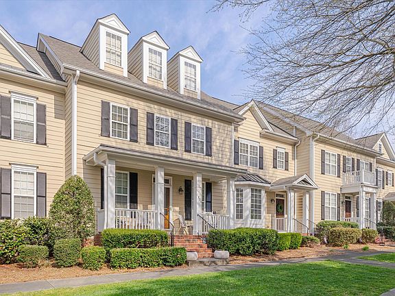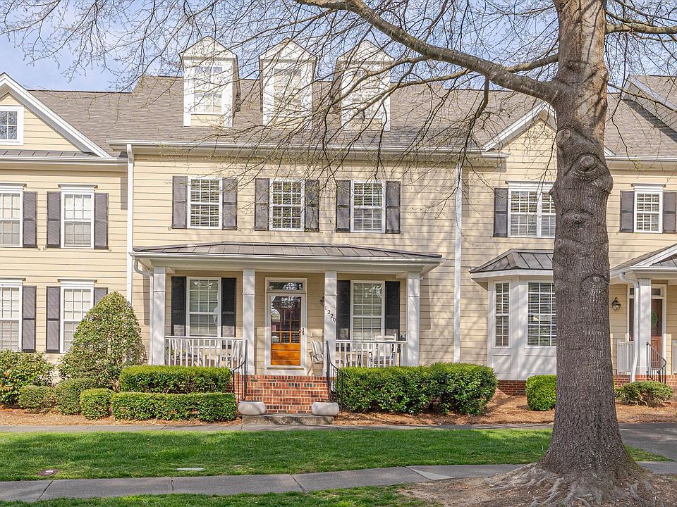 Heritage townhome with first floor primary bedroom, 2 spacious bedrooms upstairs plus a loft area! Sip your coffee on the rocking chair front porch and greet your neighbors as they stroll on by! Gleaming hardwoods on main floor with formal dining room, open 2 story living room with electric fireplace! Kitchen is the perfect size for cheffin around! Plenty of counter and cabinet space and pantry! First floor primary bedroom is spacious and offers WIC, ensuite with walk in shower and dual vanities, large linen closet! Detached 1 car garage and sweet little fenced courtyard in between with beautiful perennials, japenese maple, crepe myrtle and hydrangeas all about to bloom and a lovely brick paver patio! Don't miss this one!