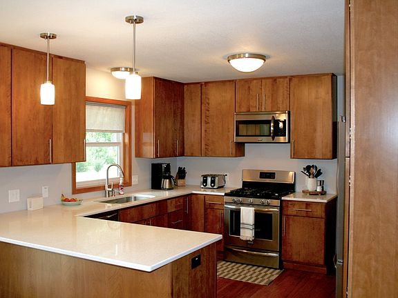 Don't miss this beautiful, fully-renovated family home in a prime location across from the public schools and daycare! The main floor interior was completely remodeled in 2015. The open-concept kitchen features new Bertch brand cabinetry with slow-close doors and drawers, top of the line stainless steal Frididaire appliances and Riverstone Quartz countertops. Two brand new full bathrooms feature tile floors, a Bertch vanity and an Oasis vanity top. The main living area has new hardwood bamboo flooring and the bedrooms have new Phoenix brand carpet. New sliding door leads out to cement patio and large, shaded backyard. There is main floor laundry with washer and dryer included. Custom blinds stay with home. Most all plumbing and electrical were updated in 2015. There is a new central air conditioner and new water heater as well. The basement has potential for 2 more bedrooms, large family room, and 3rd bath.