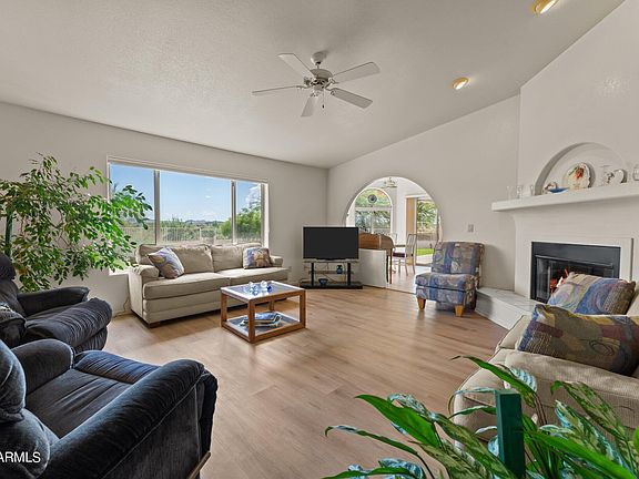 Welcome to your private hilltop sanctuary, where tranquility meets elegance in a natural setting. Nestled among lush trees and sprawling lawns, this home offers unparalleled privacy and breathtaking mountain views. Enjoy panoramic vistas from your elevated perch, surrounded by greenery and mature landscaping. A large, beautifully manicured lawn provides ample space for recreation, gardening, and relaxation. Ideal for outdoor dining, entertaining, or transforming into your personal garden house. Features a well-maintained grass area and dedicated garden space, perfect for cultivating your favorite plants. An attached two-car garage offers convenient parking, while a detached one-car garage provides additional storage, a workshop, or potential guest house. Inside the airy layout connects the living spaces seamlessly, creating an inviting atmosphere for gatherings and entertainment. Including a master suite large enough to accommodate a cozy sitting area. Two bathrooms are well-appointed for comfort and functionality. The great room features an electric fireplace, adding warmth and charm to the heart of the home. Enjoy your meals with a backdrop of stunning scenery through expansive windows. This exceptional home is a gem, blending modern convenience with the beauty of nature.