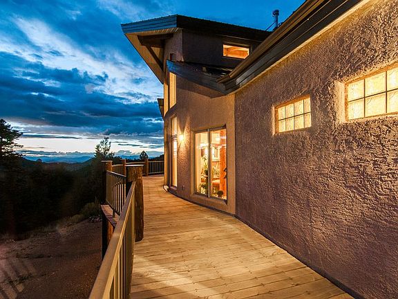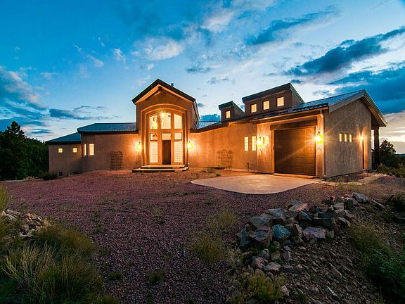 "Epic" Sangre de Cristo Mountain range views from this Custom Gary Gene Olp designed home. Remarkable architecture is perfectly adapted to this premier 35 acre wooded, 180 degree mtn view lot. You will enjoy the elegant layout of this contemporary southwest style home including spacious main floor BR, his & her office spaces, lg southwest wood-burning fireplace & hearth, expansive deck, exotically curved walls, lower level guest rooms, each w/ its own romantic fireplace & private entry. Builder used solid, environmentally green technology such as SIP (Structural Insulating Panels), offering superior insulation & max. energy efficiency, radiant zoned heating syst, air filter & exchange syst. The kitchen is lg w/ a view, next to the main level garage for easy access to pantry & kitchen areas. There is an add'l 2 car lower level garage & large basement big enough for a workshop or rec room. Construction & landscaping meets Forest Service recommendations for fire mitigation. A MUST SEE!
