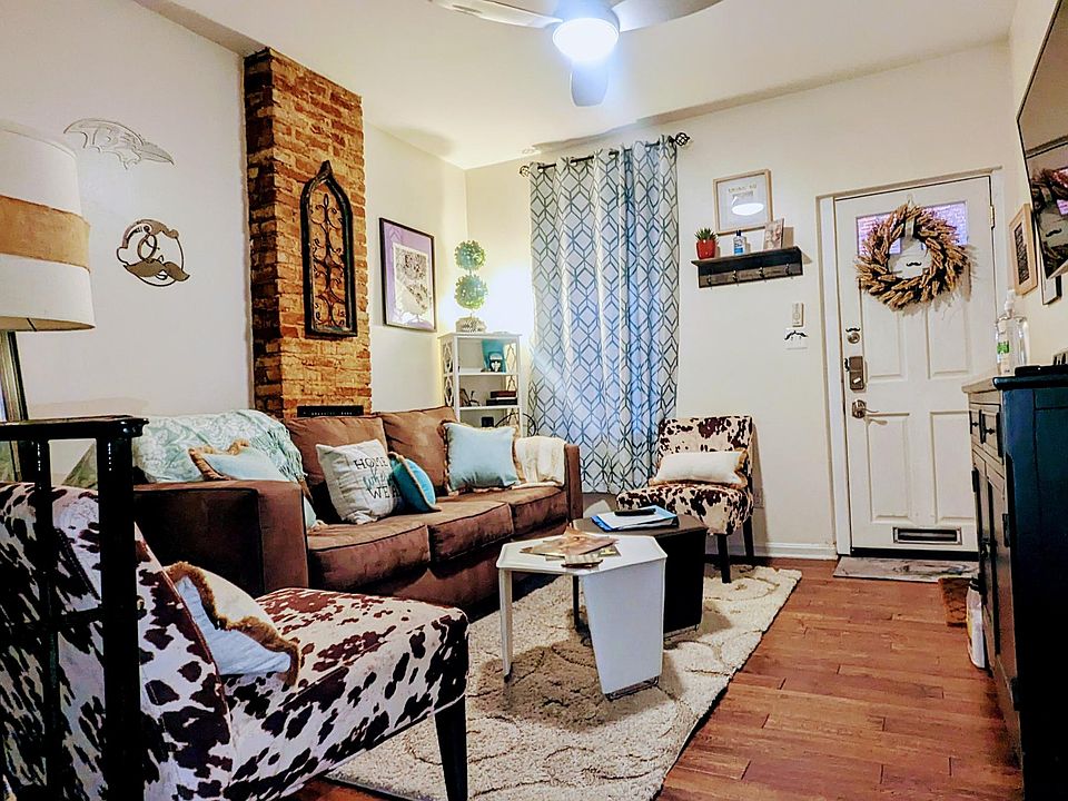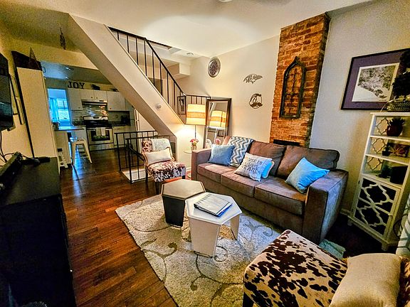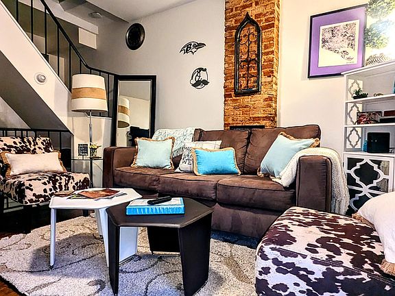 property is available furnished (as seen in pics) or unfurnished. 2 bedroom , 2 bath rowhome in the heart of Federal Hill. This rowhome is on a very quiet block behind the Ace Hardware but only just two blocks from Cross St Market. With 1 bedroom top floor and 1 bedroom on lower level, there are no walls or doors operating the space into tint rooms. All humans welcome. EHO area 30 parking permit required to park on the street. Conveniently located one block from the West Street Garage. This home has been modernized, but retains much of its historic charm. Open concept first floor and cathedral ceilings on 2nd floor make cozy space feel much larger! Kithen has Range stove, refrigerator, micowave,dishwasher, tiled backsplash, granite counters. Two full Bathrooms: 1st floor bath has walk in shower stall. Second floor bedroom has a full ensuite bathroom (shower/tub combo)with exposed brick. Walk up the open concept stairs to the loft style master bedroom. Open and airy with vaulted ceilings, exposed brick and comfy new wall to wall carpet Lower Level Bedroom- Currently has 2 twin beds and gets natural light from the one exterior window This cozy space is best for smaller stature guests, since the ceiling is a bit lower than the rest of the house. Laundry room has additional storage and full.size washer dryer. Small fenced in private patio out back. Available either as a furnished monthly or unfurnished rental for security deposit is 1 month's lease. application fee and credit check required. furnished rental price is for 2 people. $$150/person additional monthly fee for furnished rental Pets allowed on a case by case basis with additional fee and pet deposit. No smoking in house of any kind.