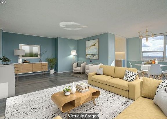 Million-dollar views of city/bridges/sunset from this West-facing 10th floor corner unit.Gorgeous remodel,now a true 2 bedroom.Carrara counters,brushed matte gold faucet,stunning new light fixtures.AC for hot summer days.Double paned windows. New LVP flooring.Deeded underground parking & storage space.Rooftop seating on 18th fl with 360-degree views of Hood and St Helens/downtown skyline.Rooftop party room,covered/gated BBQ,patio,tables can be reserved,community garden.WFH or use 2nd bed for TV