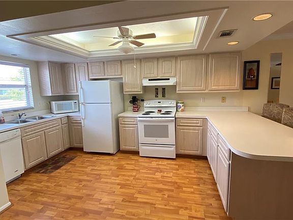 Large open floor plan with water and pool views - fully furnished so do nothing but move in .. Kitchen has plenty of cabinets and countertop space breakfast bar that seats 4 - crown molding in kitchen - Master bedroom is off the kitchen with a nice sized master bathroom and walk in closet. Second bedroom has two twin beds and a bathroom with walk in bathtub. Lanai across the back leading to the pool and the dock.. wide canal with straight shot to river..