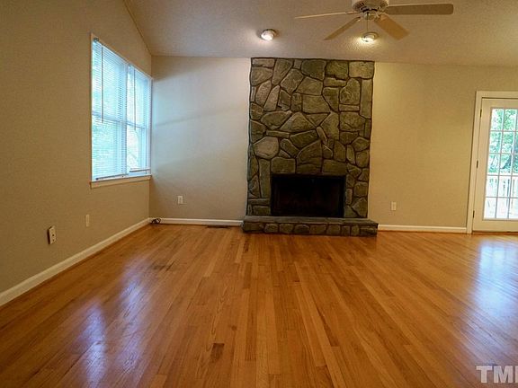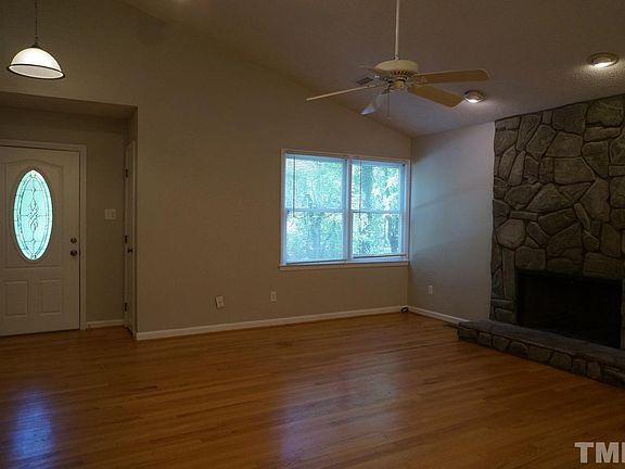 Available now! This updated 4bd/3ba home features a great open floor plan, including open living and kitchen area that is perfect for entertaining! Large bonus room with inside and outside entrances, full bath, and wet bar area could be a 5th bedroom or in-law suite. Living room, dining room, and kitchen boast vaulted ceilings, with beautiful wood floors in living and dining rooms and a stone fireplace in the living room. The large deck adjoining the dining area is perfect for relaxing or entertaining. Low-maintenance wooded lot adjoins small creek. Close to everything via Kildaire Farm Rd, including downtown Cary, US 1/Hwy 64, NCSU and RTP!