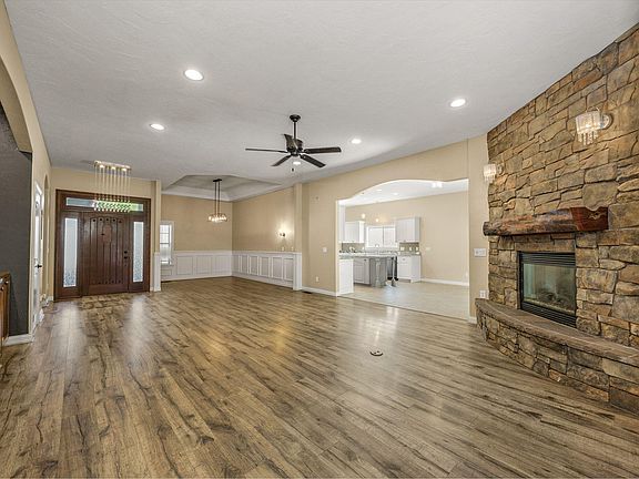 - Breakfast Bar, Built-in Features, Ceiling Fan(s), Central Vacuum, Double Vanity, Enclosed Toilet(s), Granite Counters, Kitchen Island, Open Floorplan, Pantry, Primary Downstairs, Shower/Tub Combo, Smart Thermostat, Soaking Tub, Stone Counters, Tile Counters, Tile Shower, Walk-In Closet(s), Wired for Sound